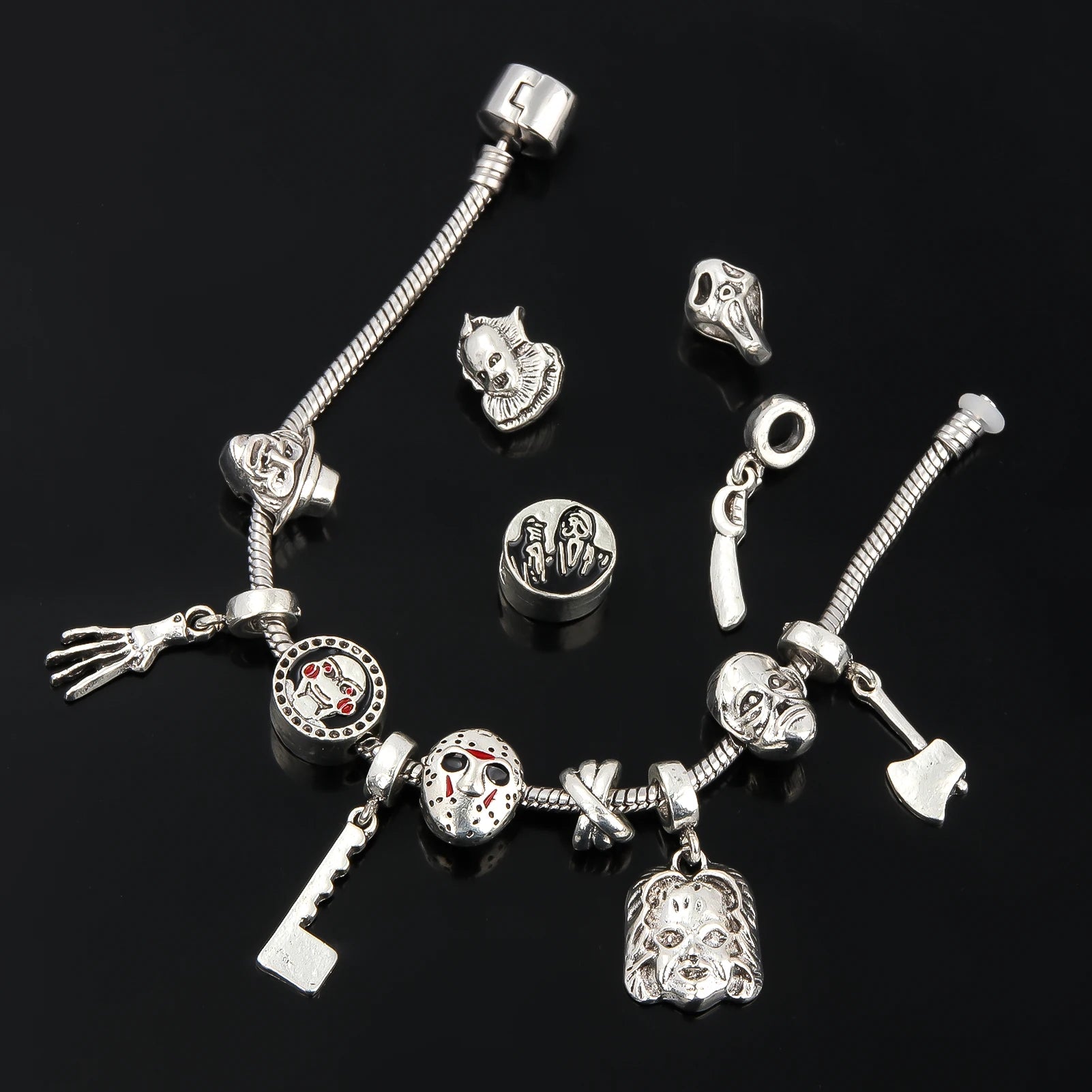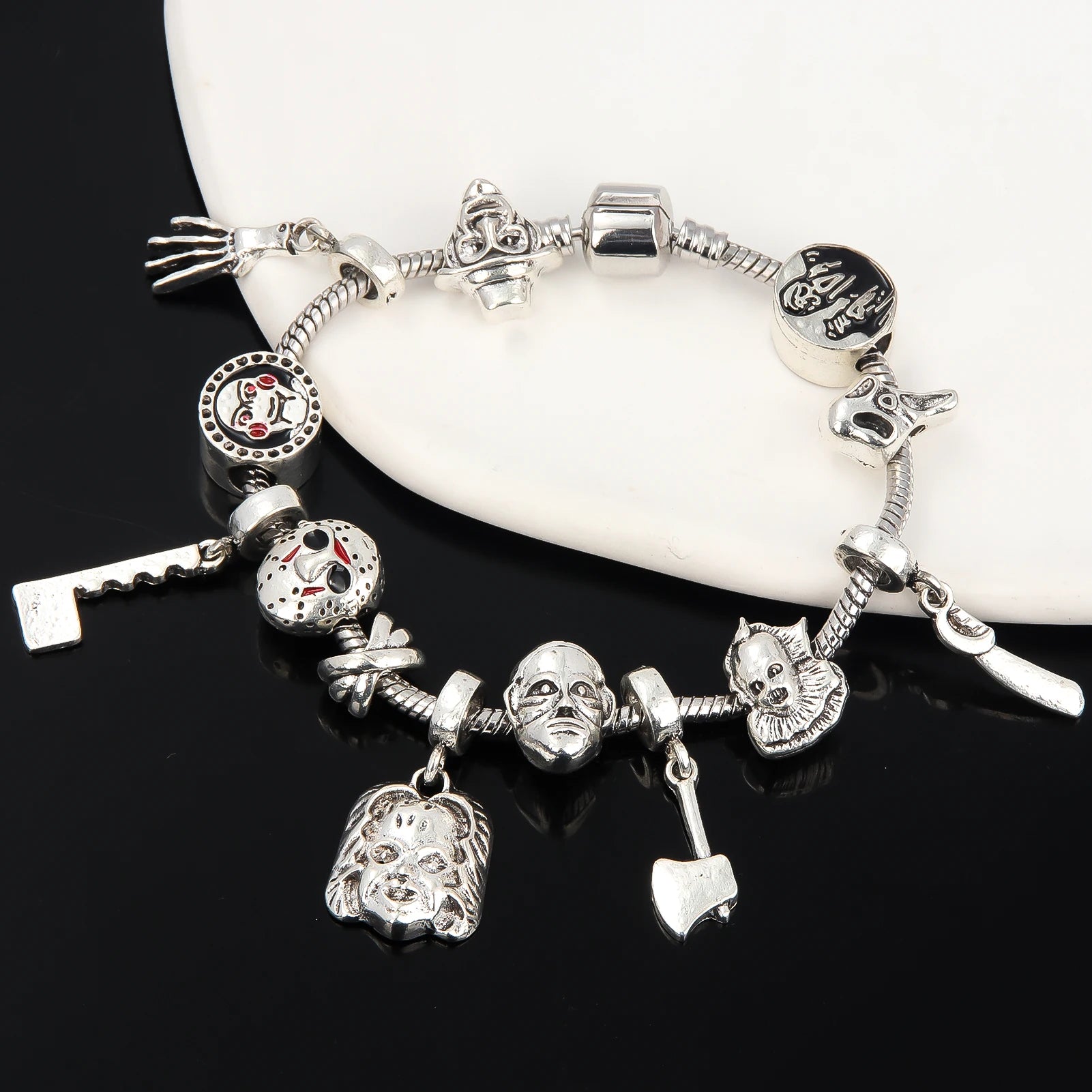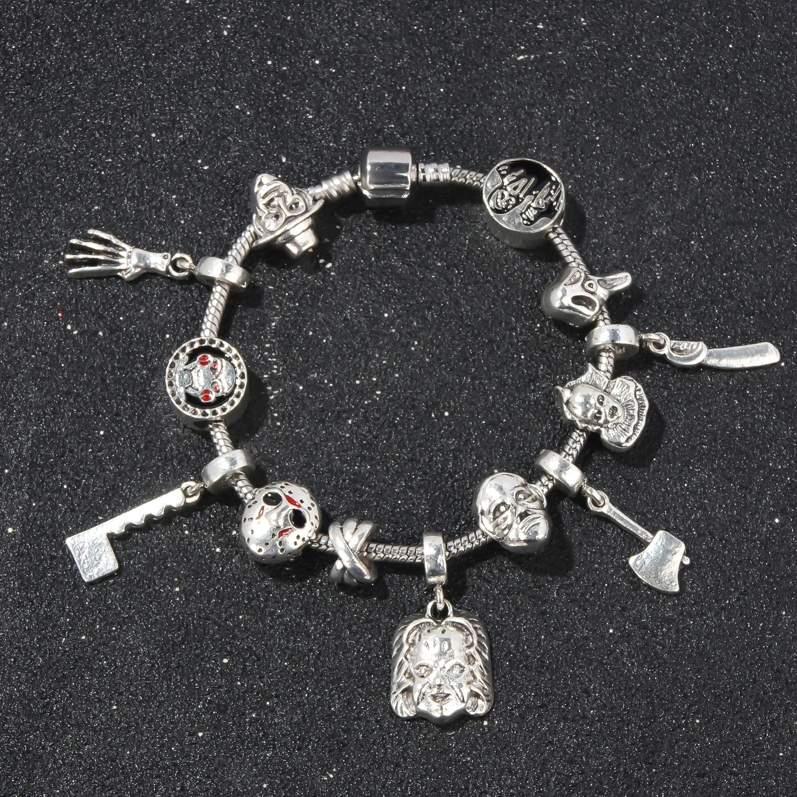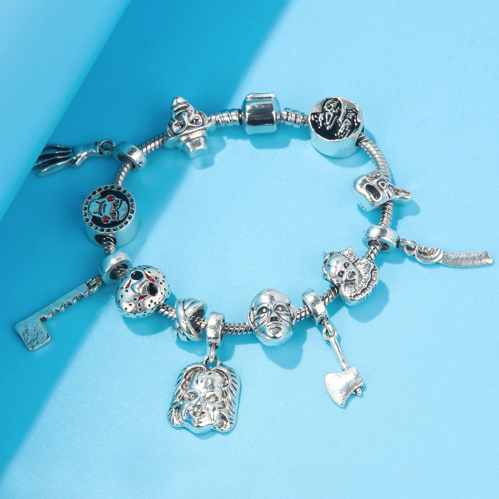 Show off your love for horror classics with this spooky charm bracelet featuring Jason, Pennywise, Jigsaw, and Ghostface. Perfect for Halloween parties, horror fans, or as a unique gift.